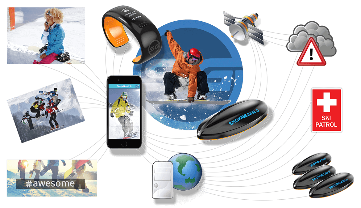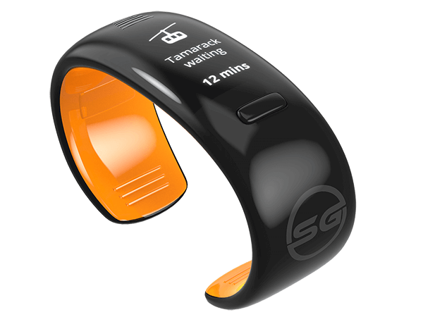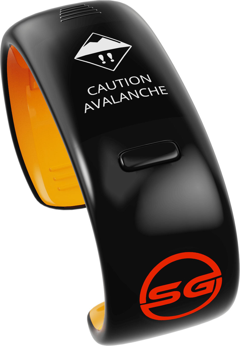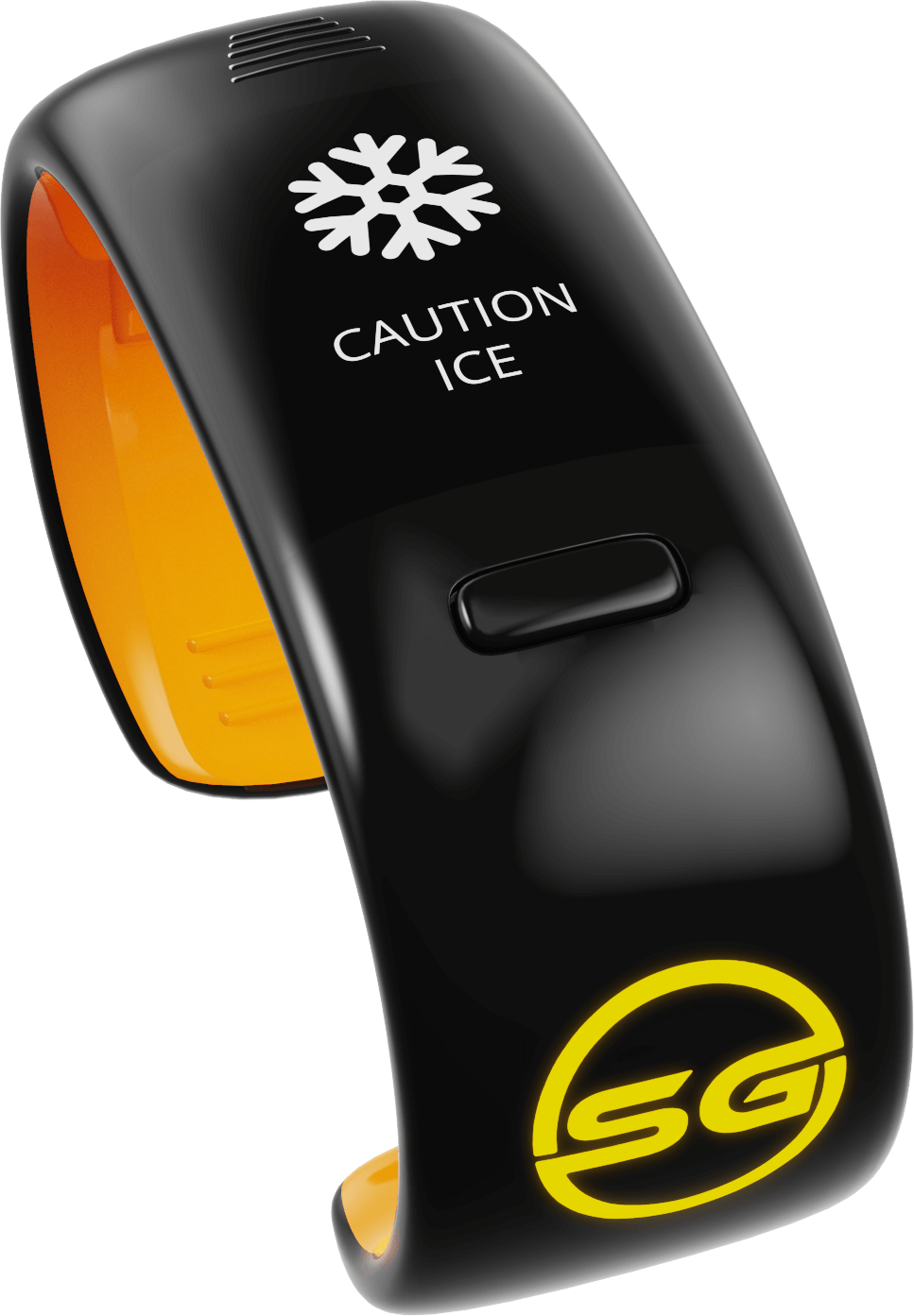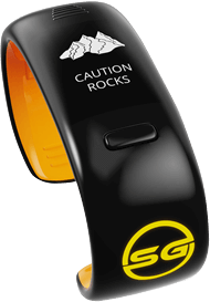 The SG20 Bracelet is outfitted with two powerful LED lights. They change color based on the type of warning. Yellow and red when the snowboarder is approaching a challenging area, green for incoming calls, and bright white for hazards.